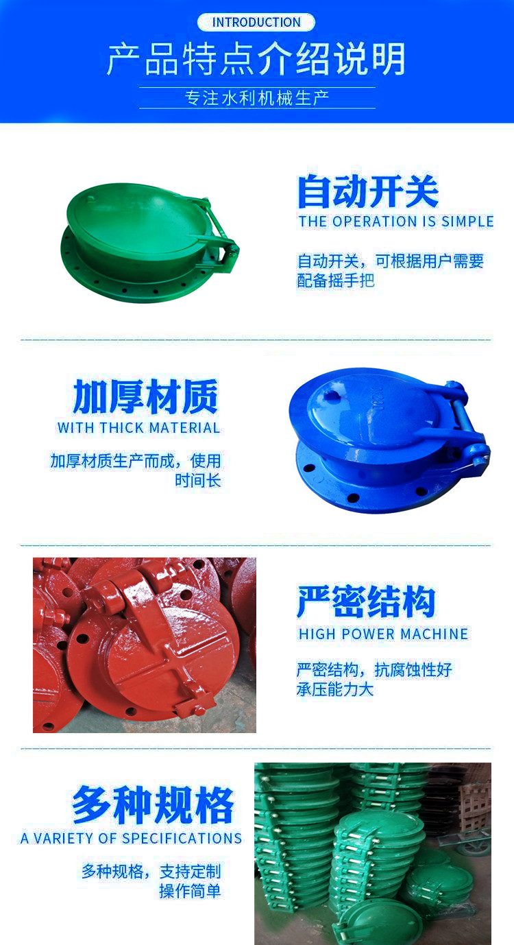 1.拍門既可法蘭連接,也可預(yù)埋安裝,即在門體后面焊上一節(jié)鋼筒,然后,用水泥預(yù)埋,結(jié)構(gòu)簡單牢靠,既省錢又省力。