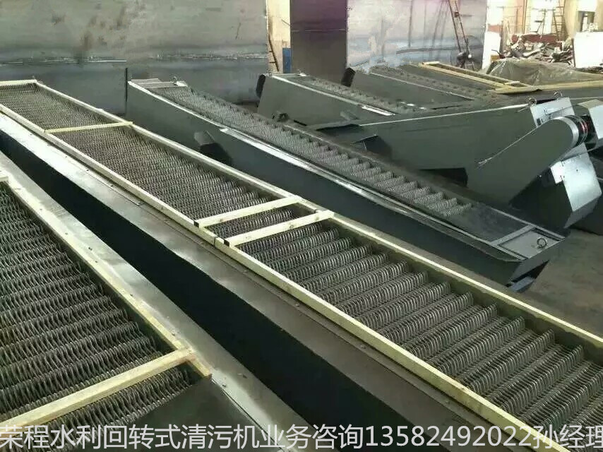 回轉式格柵除污機是由一種獨特的耙齒廠裝配成一組回轉格柵鏈。在電機減速器的驅動下,耙齒鏈進行逆水流方向回轉運動。耙齒鏈運轉到設備的上部時,由于槽輪和彎軌的導向,使每組耙齒之間產生相對自清運動,絕大部分固體物質靠重力落下。另一部分則依靠清掃器的反向運動把粘在耙齒上的雜物清掃干凈。按水流方向耙齒鏈類同于格柵,在耙齒鏈軸上裝配的耙齒間隙可以根據使用條件進行選擇。當耙齒把流體中的固態懸浮物分離后可以保證水流暢通流過。整個工作過程是連續的,也可以是間歇的。