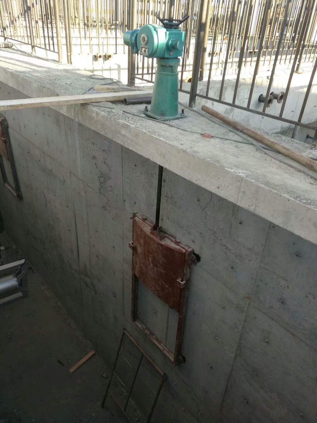 堰門采用明桿式結構形式,平面加筋型、附壁式安裝,適用于安裝在墻上的升桿式方型或圓型孔口堰門,其平整的內底與井壁緊密貼合。每個堰門帶有絲桿、接桿、連軸節及安裝在平臺上的帶推力軸承的啟閉機,并配套護罩、桿導架、基礎螺栓等所有附件,電動裝置的潤滑油也隨機提供。